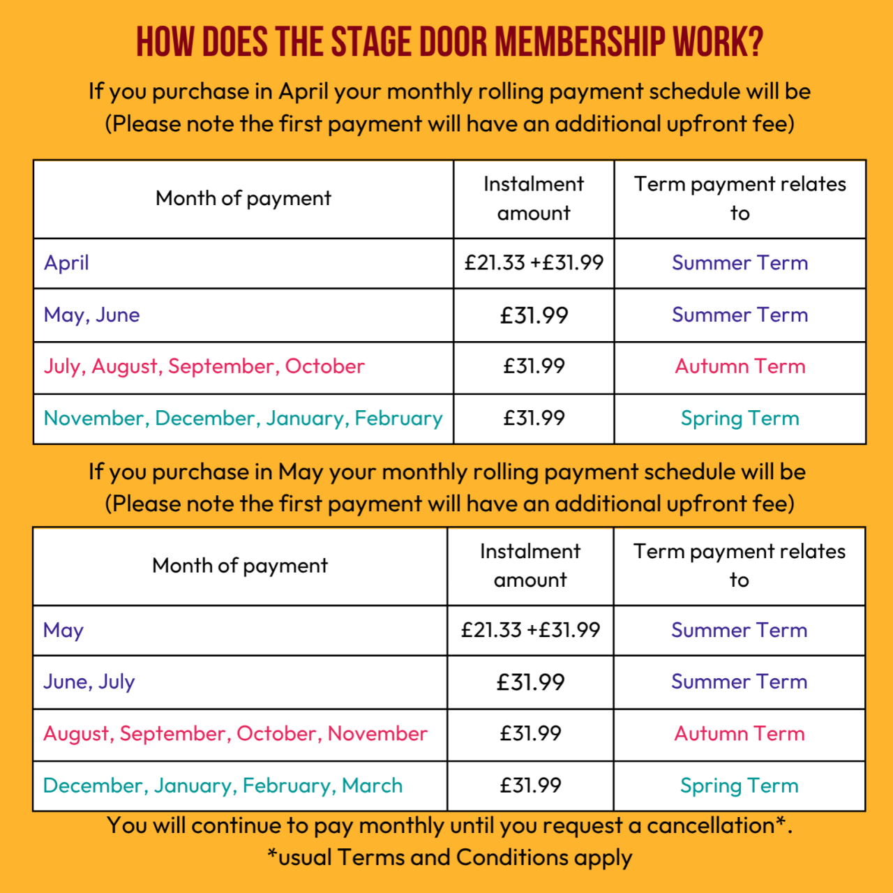 Monthly rolling subscription to spread the cost of 36 weeks into lower monthly costs